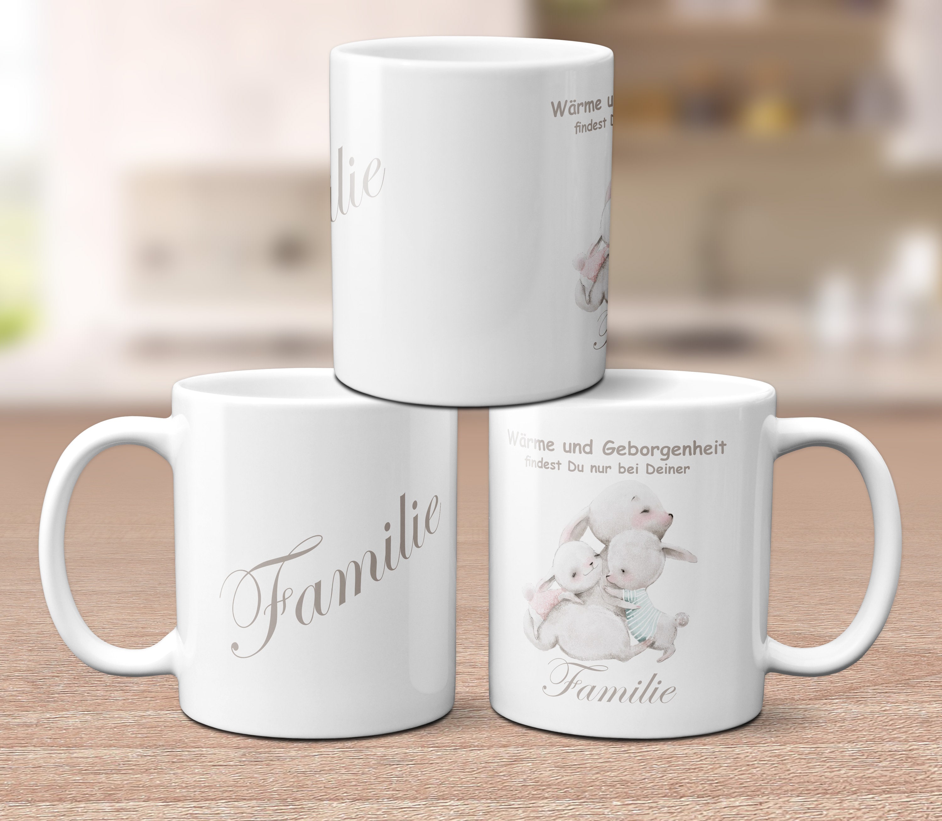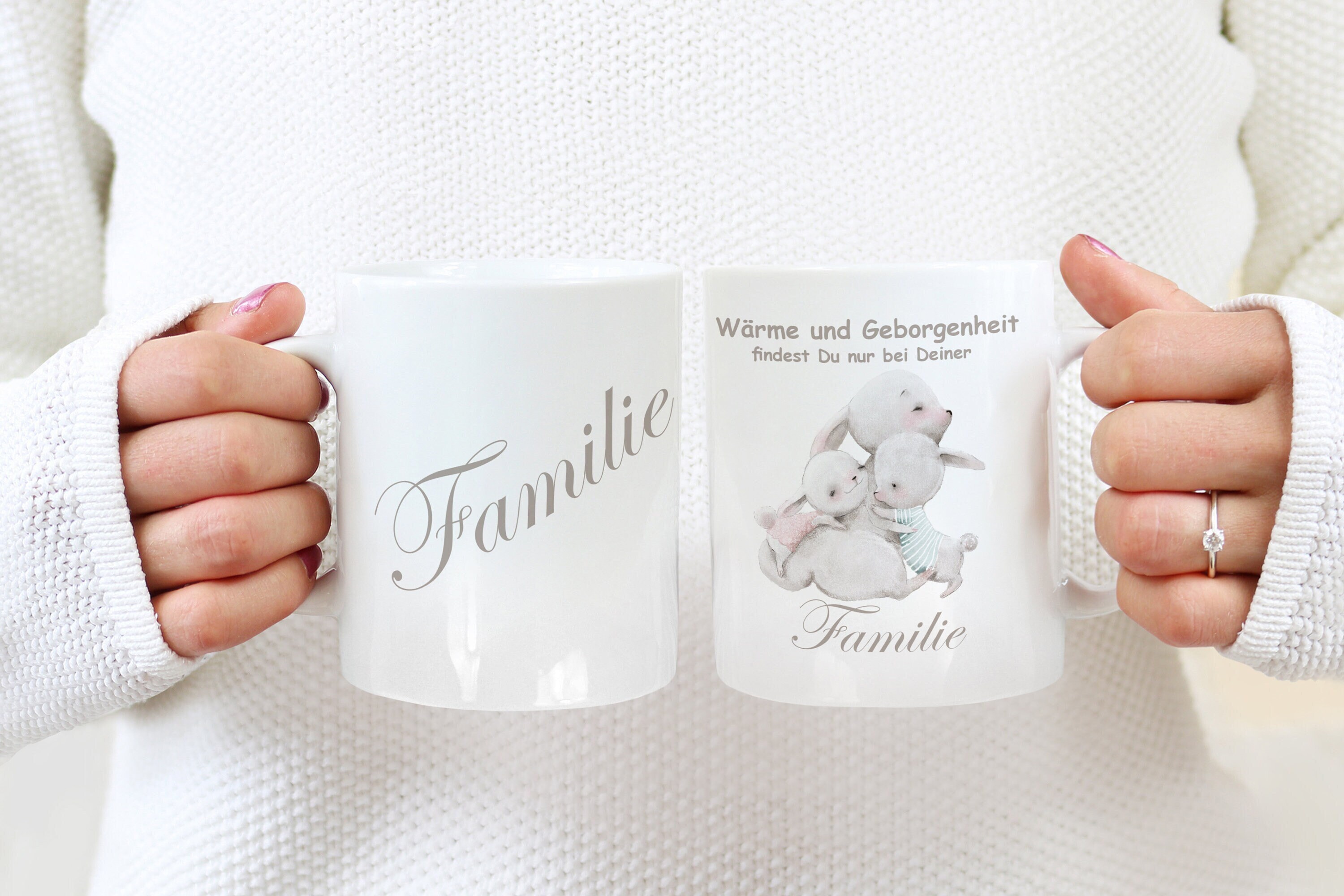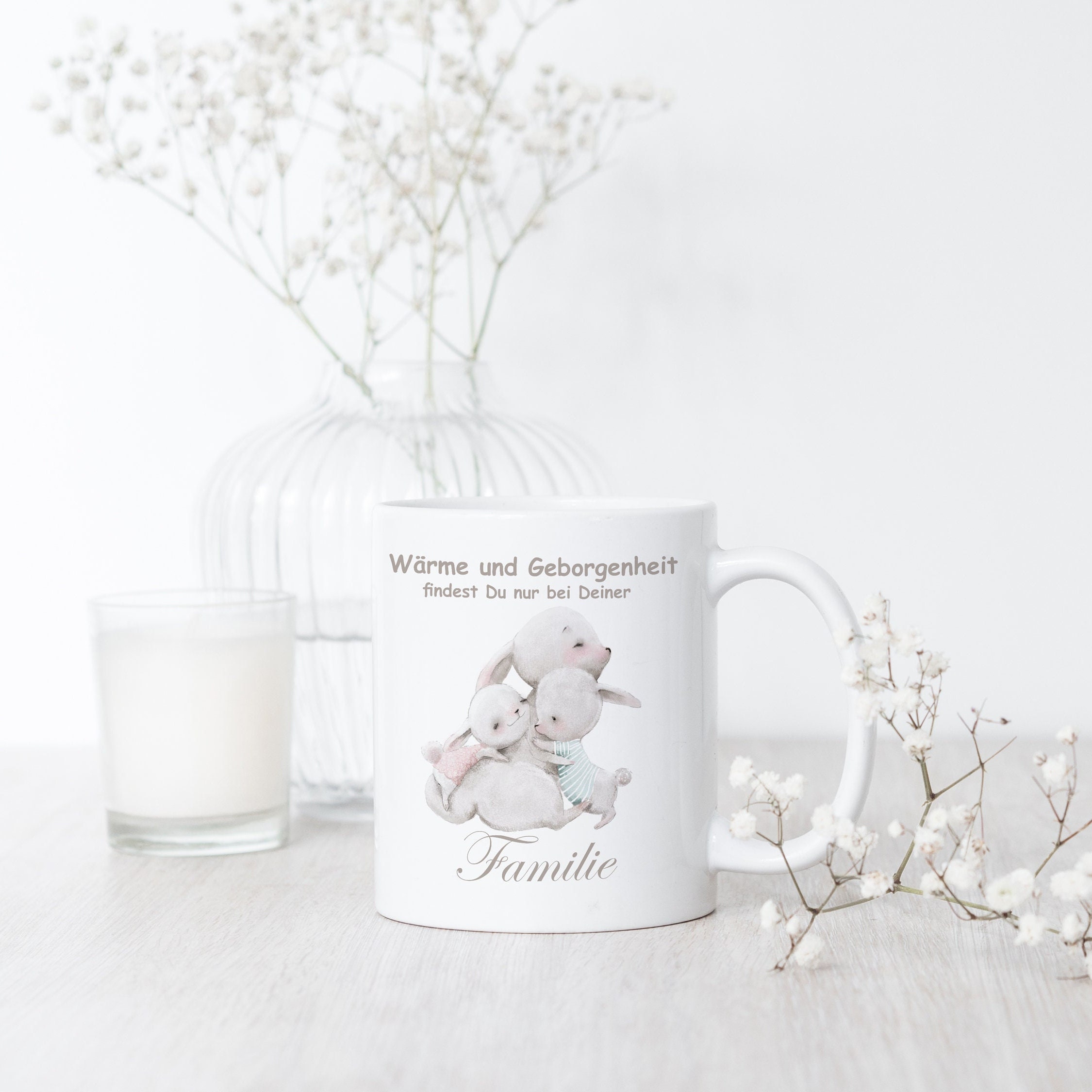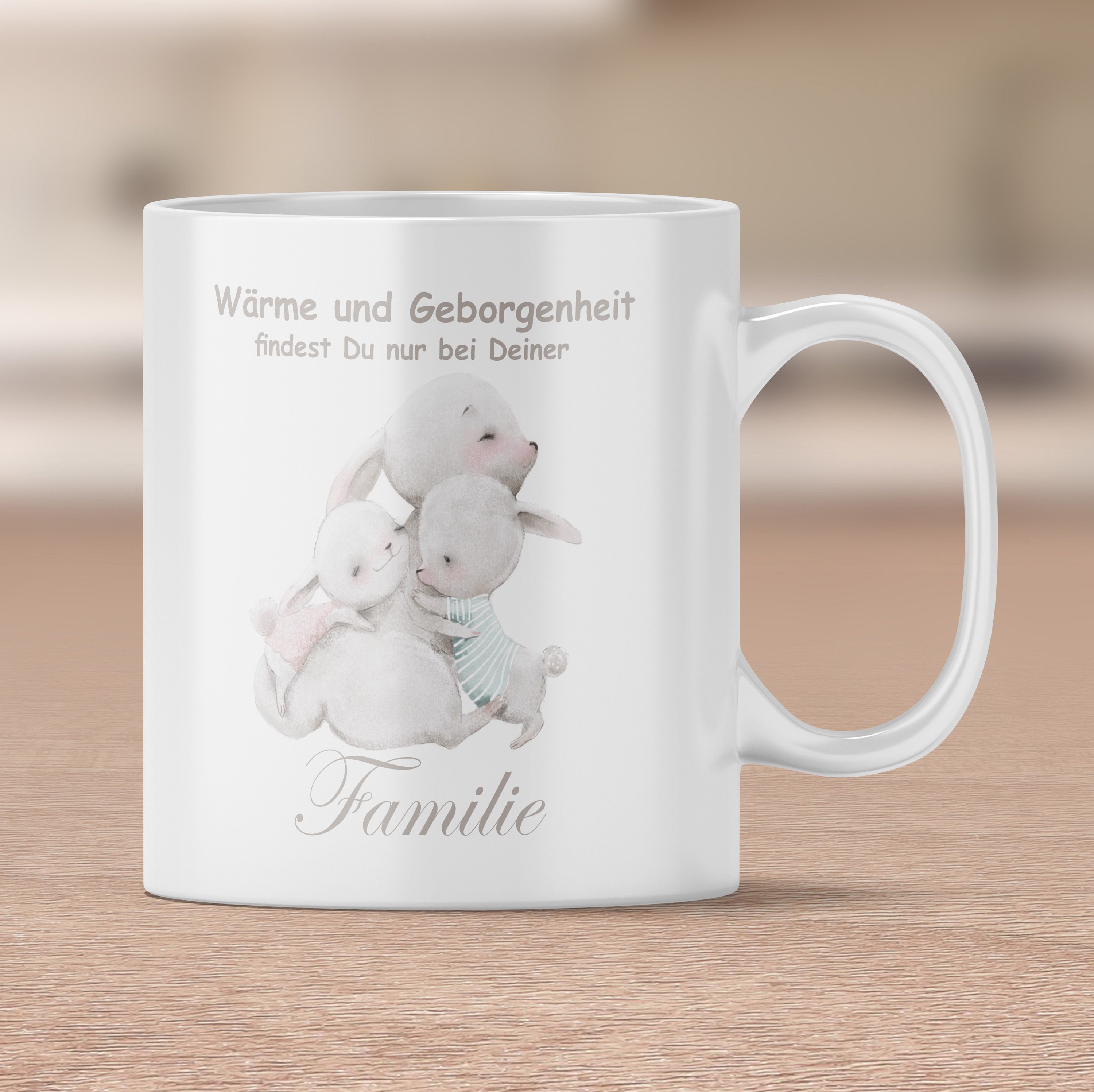 Süße Familie - Hasen Tasse mit dem Spruch "Wärme und Geborgenheit findest Du nur bei Deiner Familie".